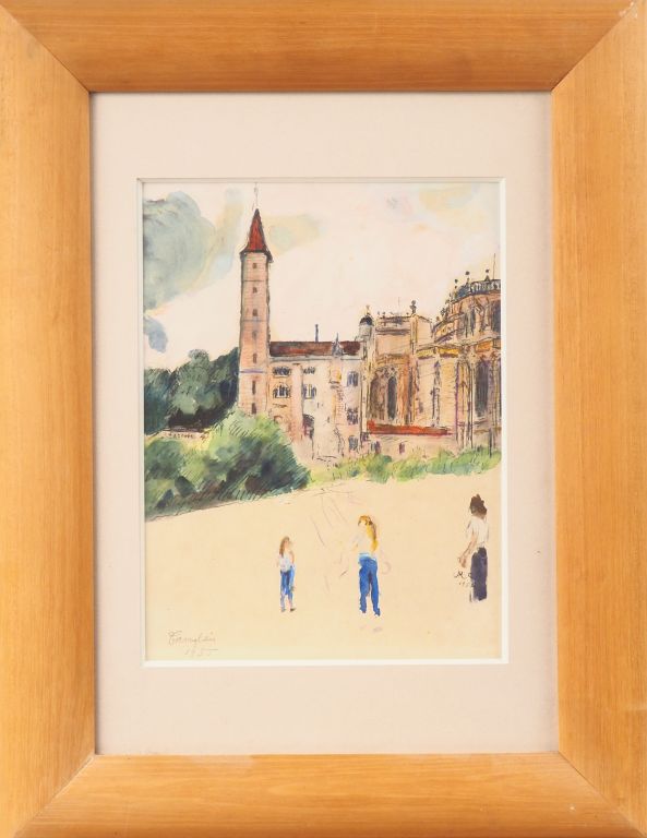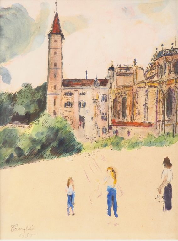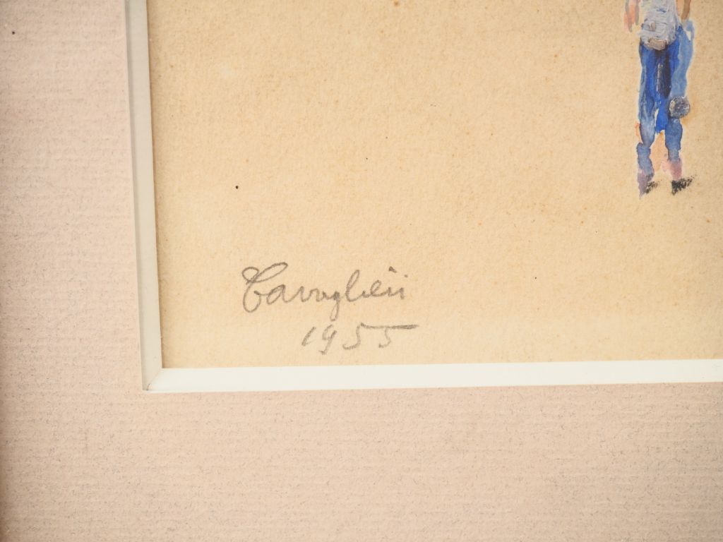 Mario CAVAGLIERI. "Personnages devant la cathédrale". Aquarelle, signée en bas à gauche et datée 1955. Dim. (à vue) : 26 x 19 cm.