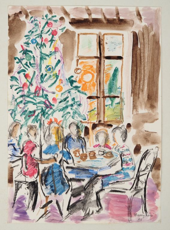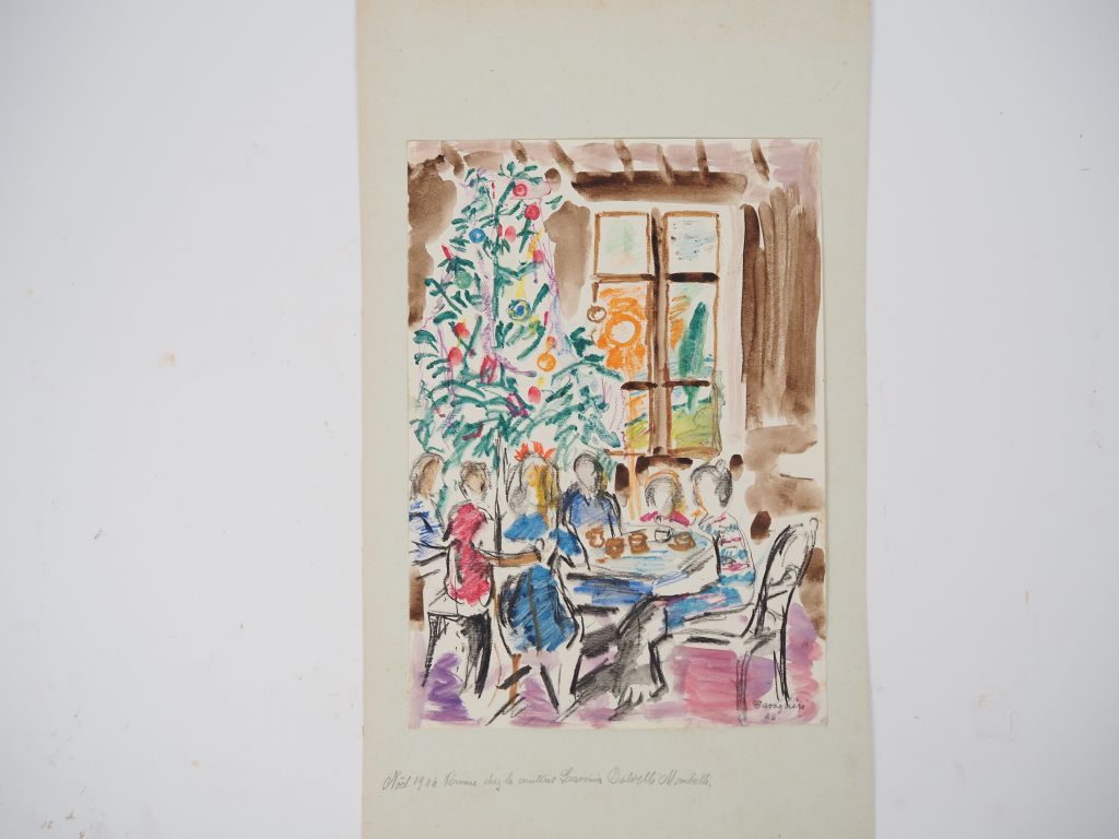 Mario CAVAGLIERI. "Repas de Noël" Aquarelle, signée en bas à droite et datée 1944. Dim. 32,5 x 23 cm