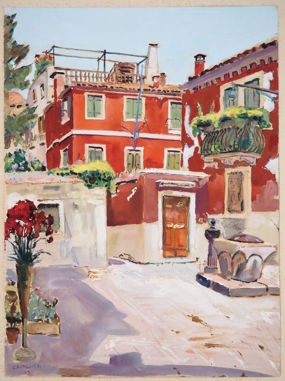 Mario CAVAGLIERI. "Venise, maison rouge dans un camp" Aquarelle gouachée, signée en bas à gauche et datée 49 Dim. 34,5 x 25,5 cm