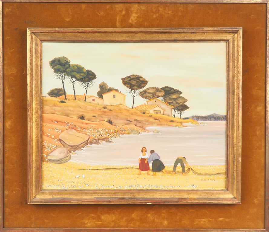 Max SAVY. "Pêcheurs près de l'étang" Huile sur toile, signée en bas à droite. Dim. 31,5 x 40 cm