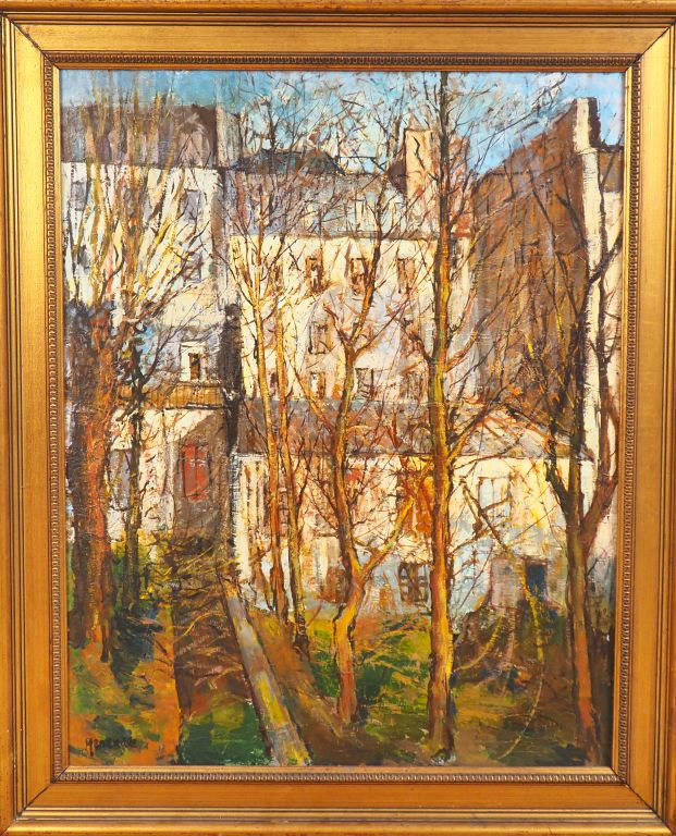 MENENDEL. "Ville ensoleillée en hiver". Huile sur toile signée en bas à gauche. Dim. 92 x 73 cm.