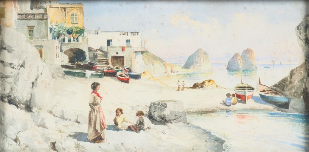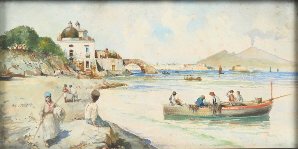 Michele CAPUANO. "Rivages animés près de Naples". Paire d'aquarelles, l'une signée en bas à gauche. Dim. (à vue) : 20 x 40 cm.