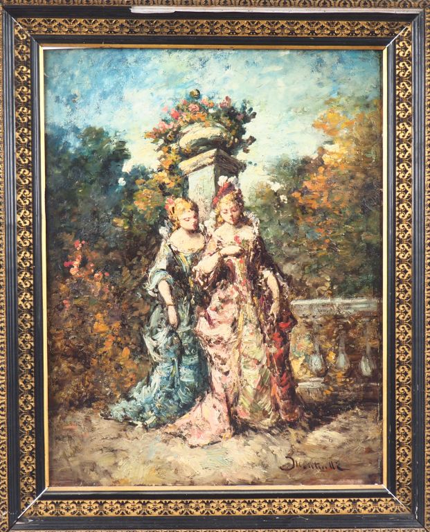 MONTICELLI. "Elégantes dans un parc" Huile sur panneau d'acajou, signée en bas à droite. Dim. 59 x 47,5 cm
