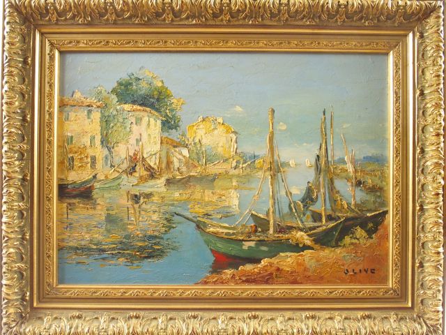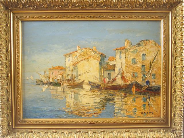 OLIVE, " Marines ". Paire d'huiles sur panneaux, signées en bas à droite. 37,5 x 53 cm