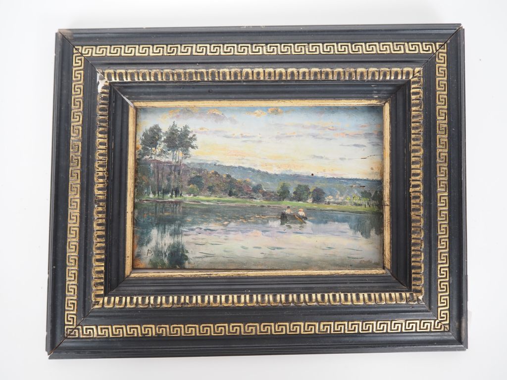 P. BLIN. "paysage lacustre animé" Huile sur panneau, signée en bas à gauche Dim. 14 x 21,5 cm (au dos, étude pour un portrait de bébé)