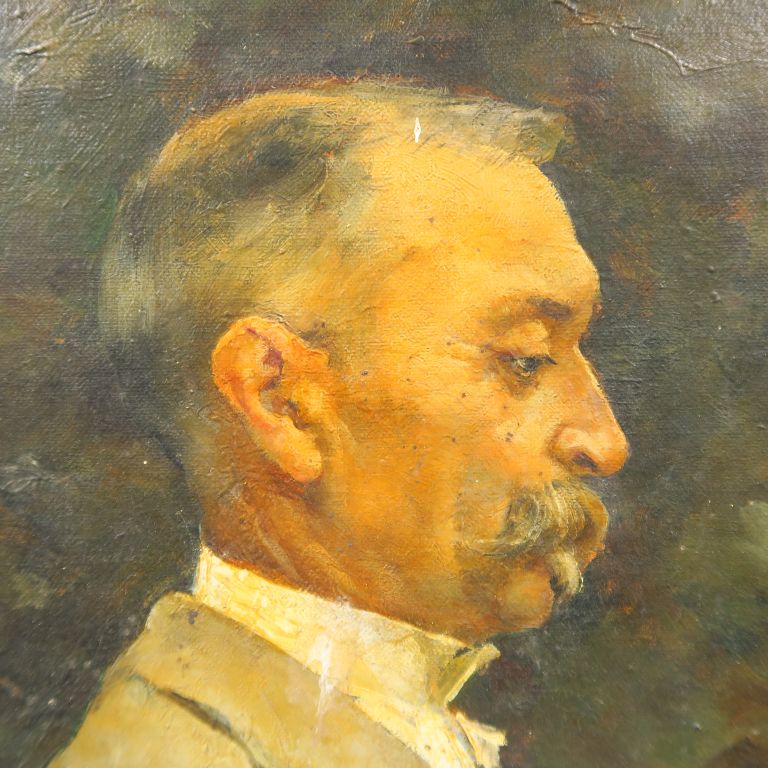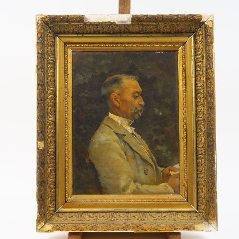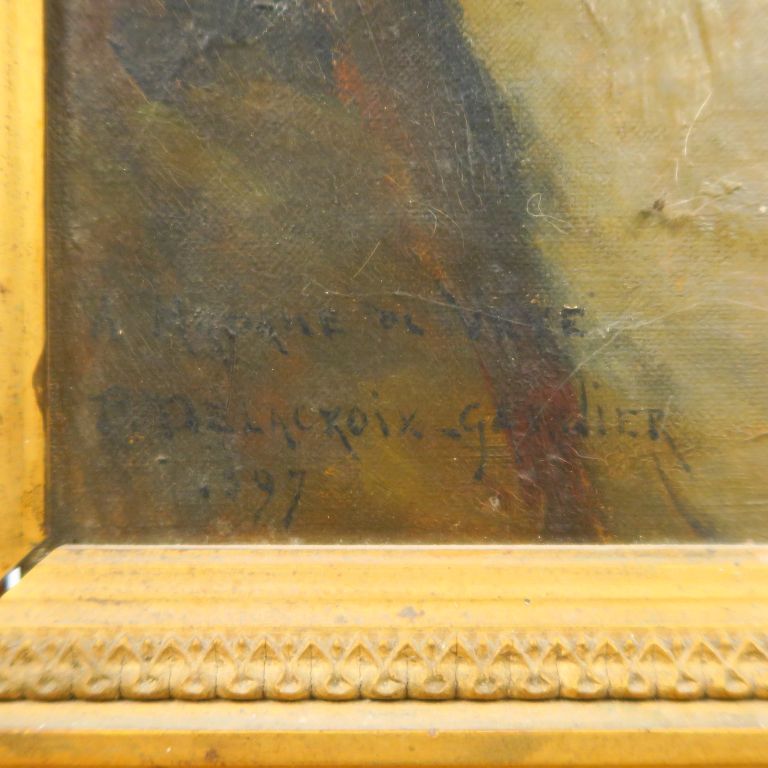 P. DELACROIX-GARNIER. "Portrait d'homme". Huile sur toile, signée en bas à gauche, datée 1897 et dédicacée. Dans un cadre en bois et stuc doré (accidenté). Dim. : 40 x 30 cm (petits accidents)