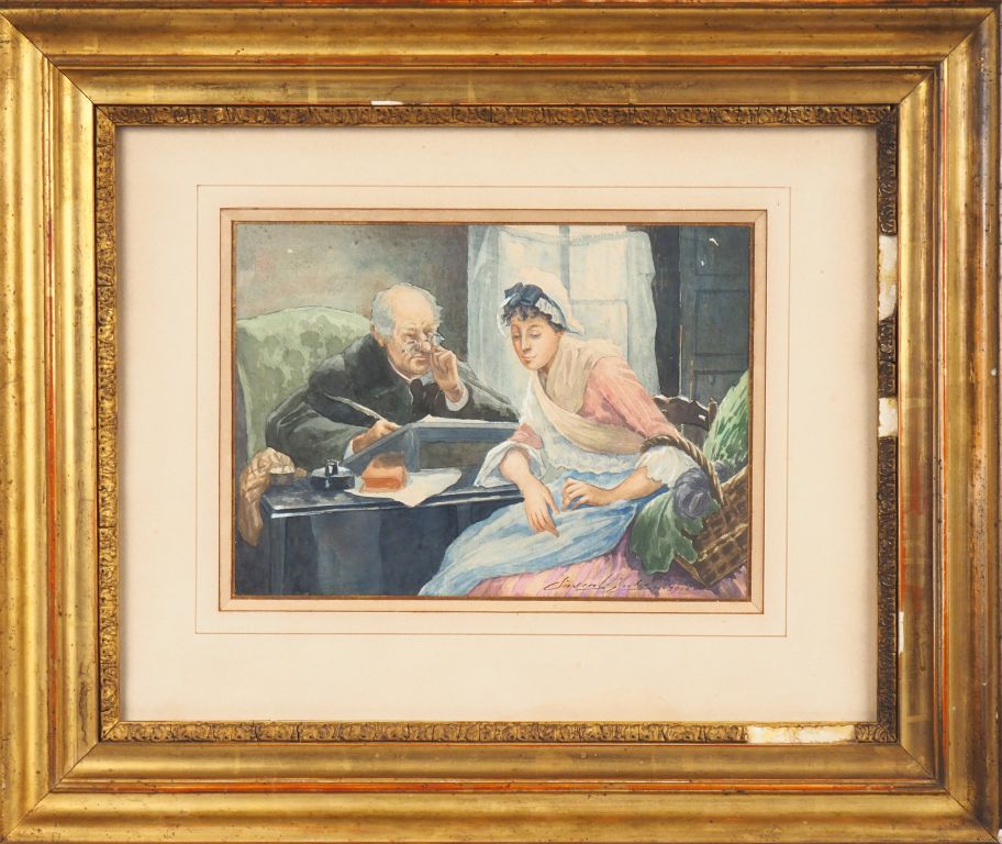 PASCAL JULES. "le vieil homme et la domestique" Aquarelle, signée en bas à droite et datée 1906 Dim. 19 x 26,5 cm