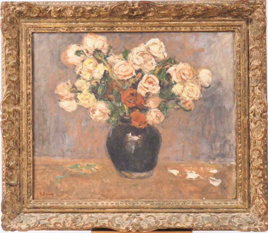 Pierre BRUNE. "Bouquet de roses". Huile sur toile, signée en bas à gauche. Dim. 54 x 65 cm.
