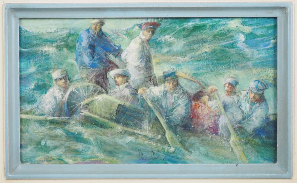 Pierre CARO. "Le radeau" Huile sur panneau, signée. Dim. 16 x 27,5 cm
