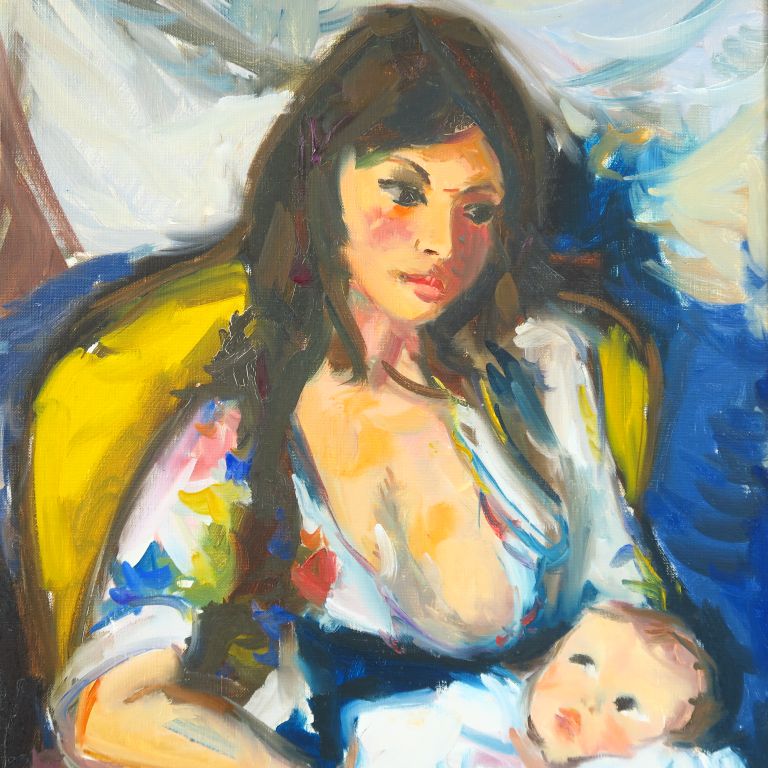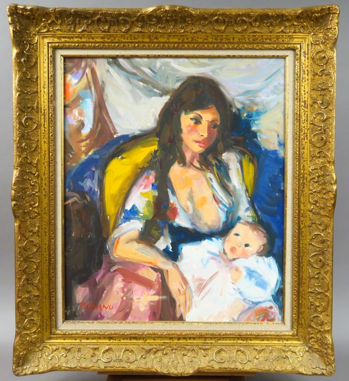 Pierre CORNU. "Maternité". Huile sur toile, signée en bas à gauche. Dim. : 55 x 46 cm.