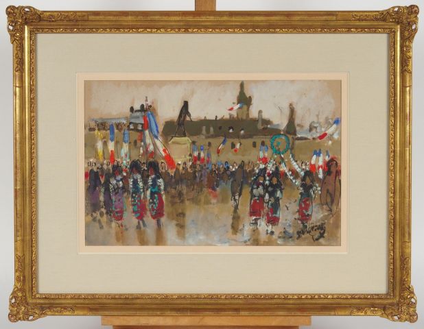 Pierre-Eugène MONTEZIN "Le 14 juillet à Colmar". Gouache, signée en bas à droite. 25 x 38.5 cm