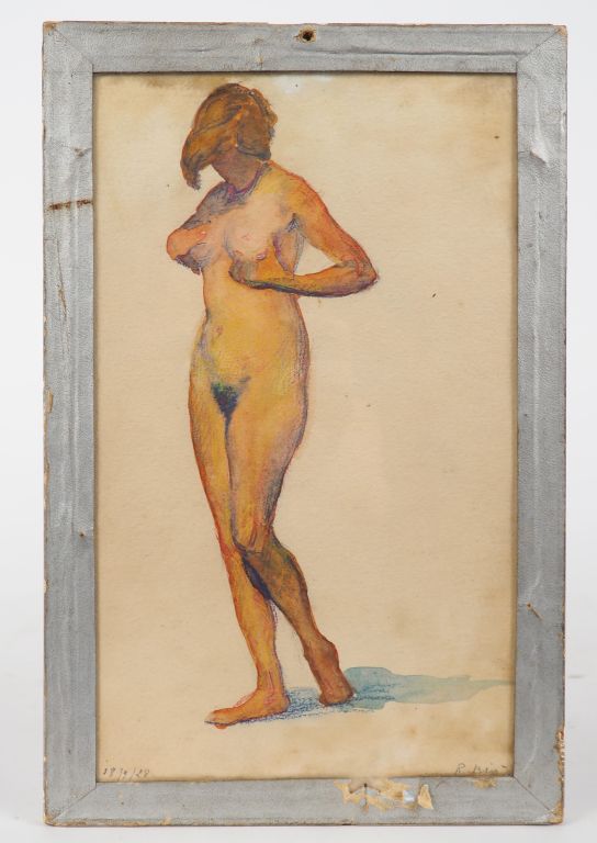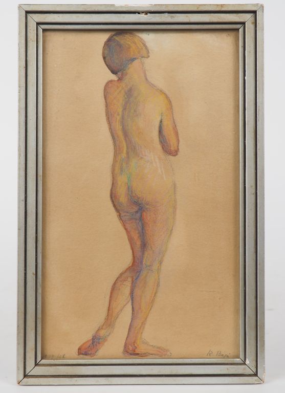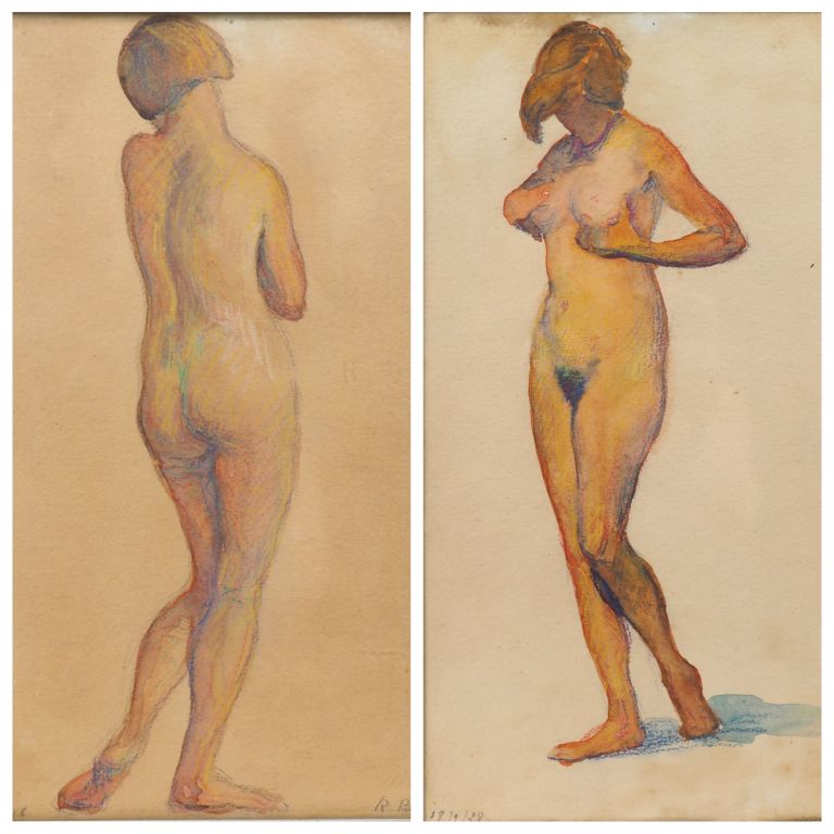 R. BEJA. "Femmes nues de dos" Deux dessins au crayon de couleurs, dans un même encadrement ou dessin double face. Dim. à vue : 22,5 x 13,5 cm