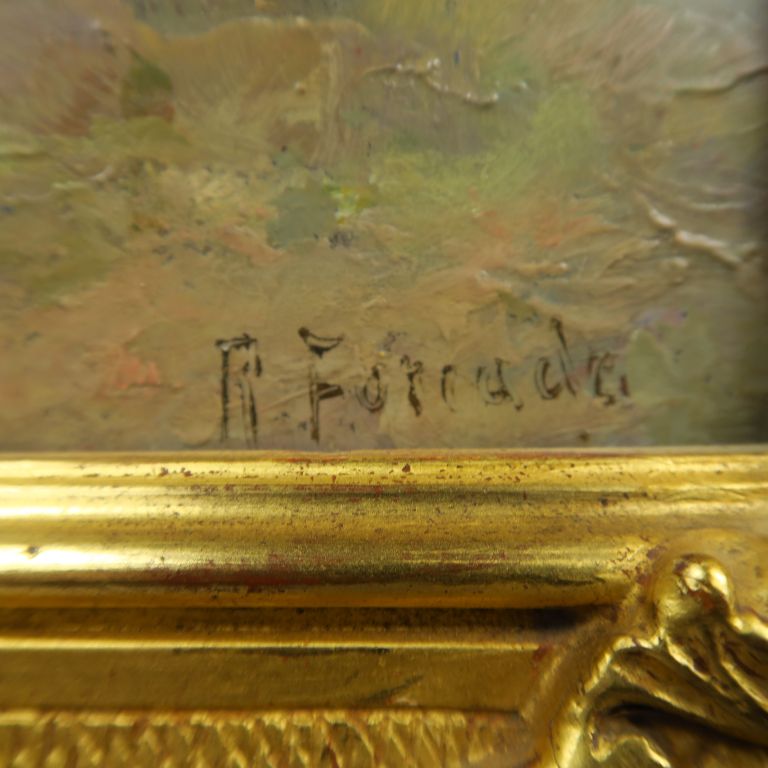 R. FORCADE. "Les lavandières". Huile sur panneau, signée en bas à droite. Dim. : 41,5 x 28 cm.