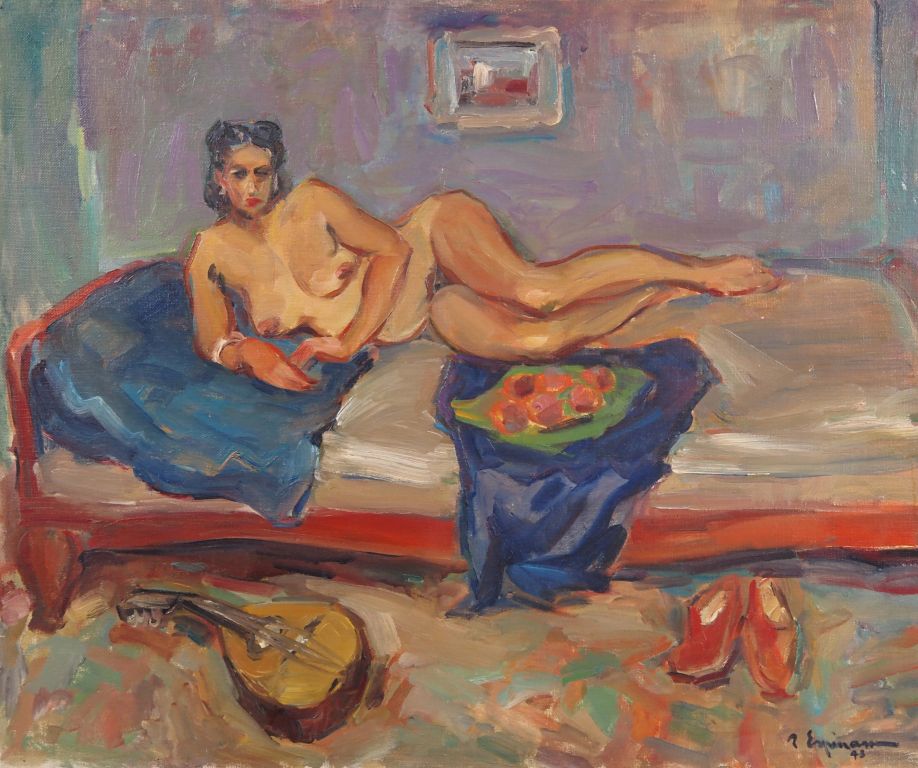 Raymond ESPINASSE. "l'Odalisque" Huile sur toile, marouflée, datée 43 Dim. 54 x 64 cm