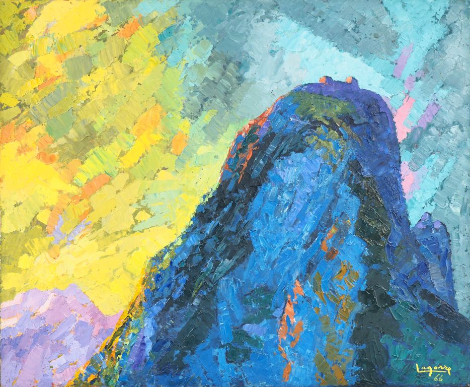 René Gaston LAGORRE. " Montségur". Huile sur toile, signée et datée "66" en bas à droite, titrée au dos. Dim. 38 x 49 cm.
