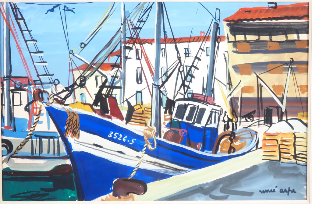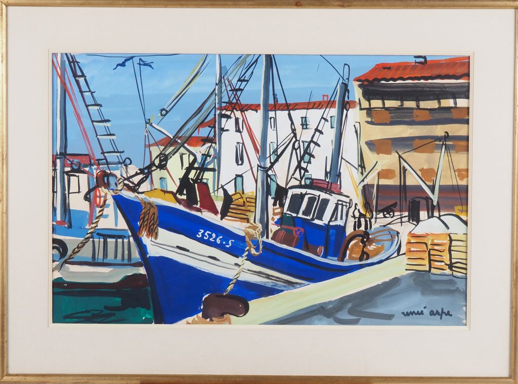 Renée ASPE. "le port de St Jean de Luz" Gouache, signée en bas à droite Dim. à vue : 37 x 56,5 cm