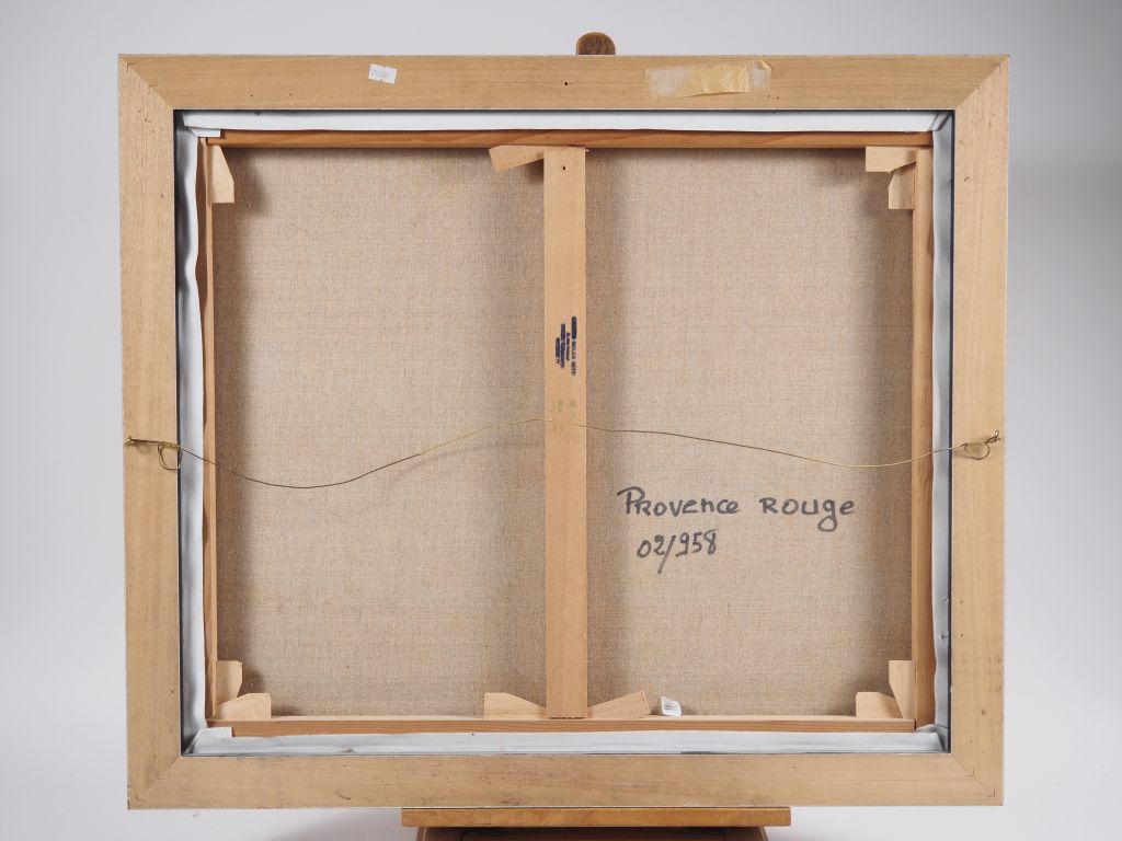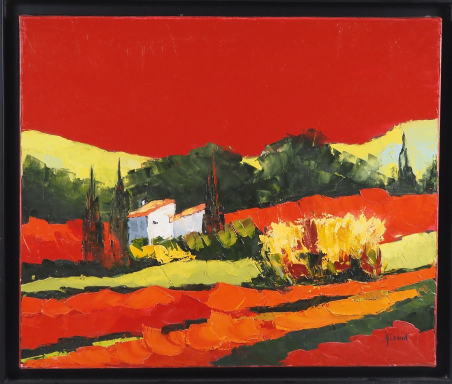 Suzanne FERAUD. "Provence rouge" Huile sur toile, signée en bas à droite Dim. 54,5 x 64,5 cm