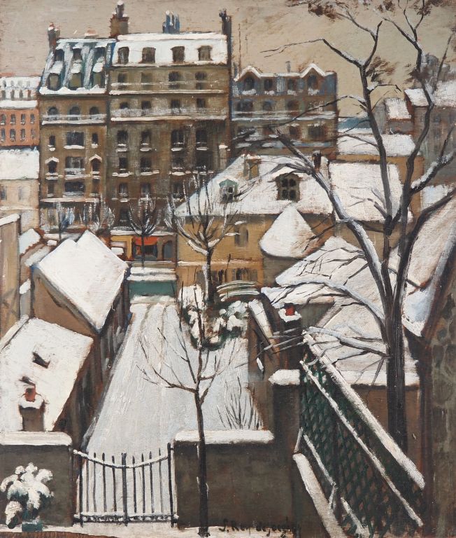 Suzanne REY de JAEGHER. "Paris sous la neige". Huile sur panneau, signée en bas. Dim. 54 x 46 cm