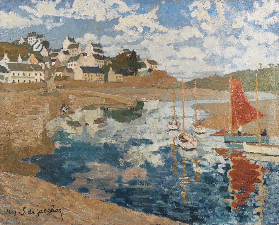 Suzanne REY de JAEGHER. "Port breton à marée basse" Huile sur toile, signée en bas à gauche. Dim 82 x 102 cm