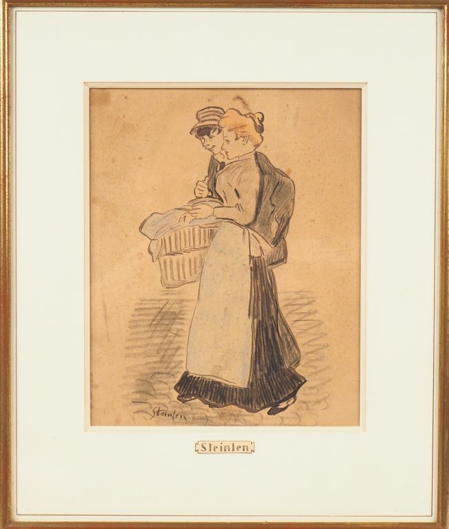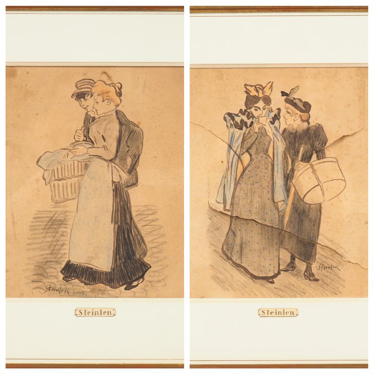 Théophile Alexandre STEINLEN. "Le jeune homme et la blanchisseuse" Dessin, signé en bas à gauche. Dim. 27 x 21,5 cm "Les coquettes" Dessin signé en bas à droite (déchiré) Dim. 27 x 21,5 cm