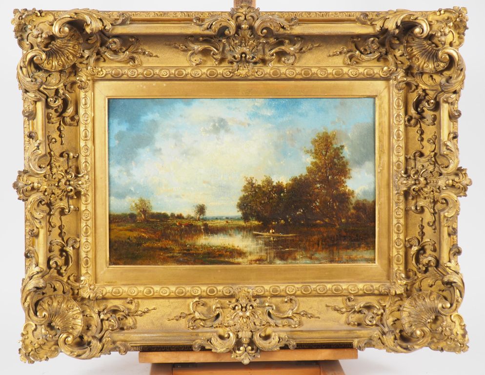 Victor DUPRE. "paysage lacustre animé" Huile sur toile, signée en bas à gauche Dim. 25 x 40 cm