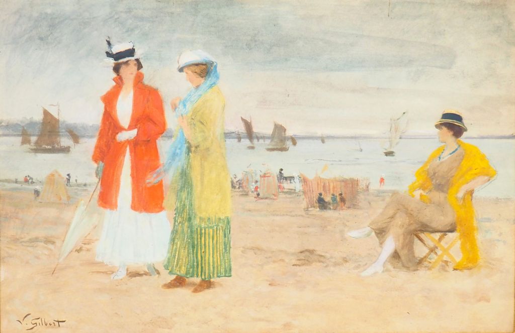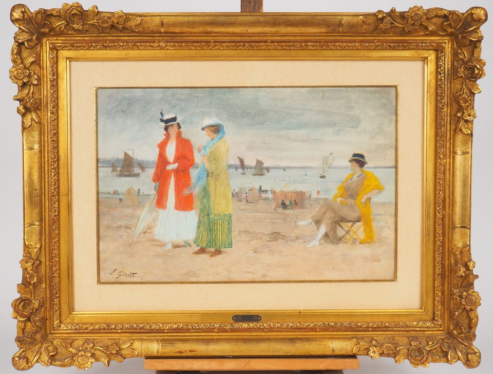 Victor GILBERT "Elégantes sur la plage" Aquarelle, signée en bas à gauche Dim. 29 x 44 cm
