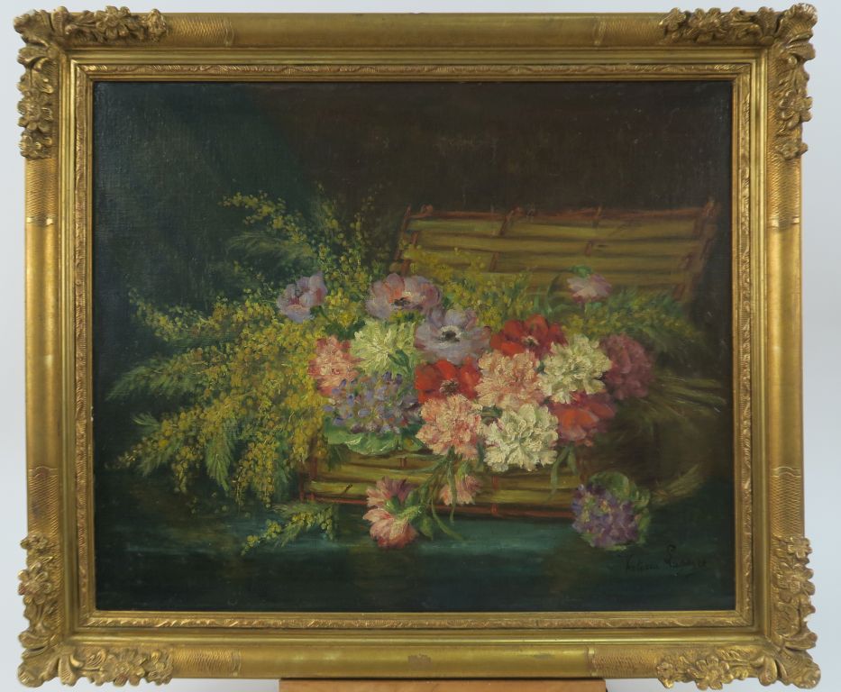Victoria LAPEYRE. "Nature morte au bouquet de fleurs". Huile sur toile, signée en bas à droite. Dim. 54 x 65 cm.