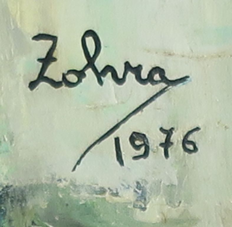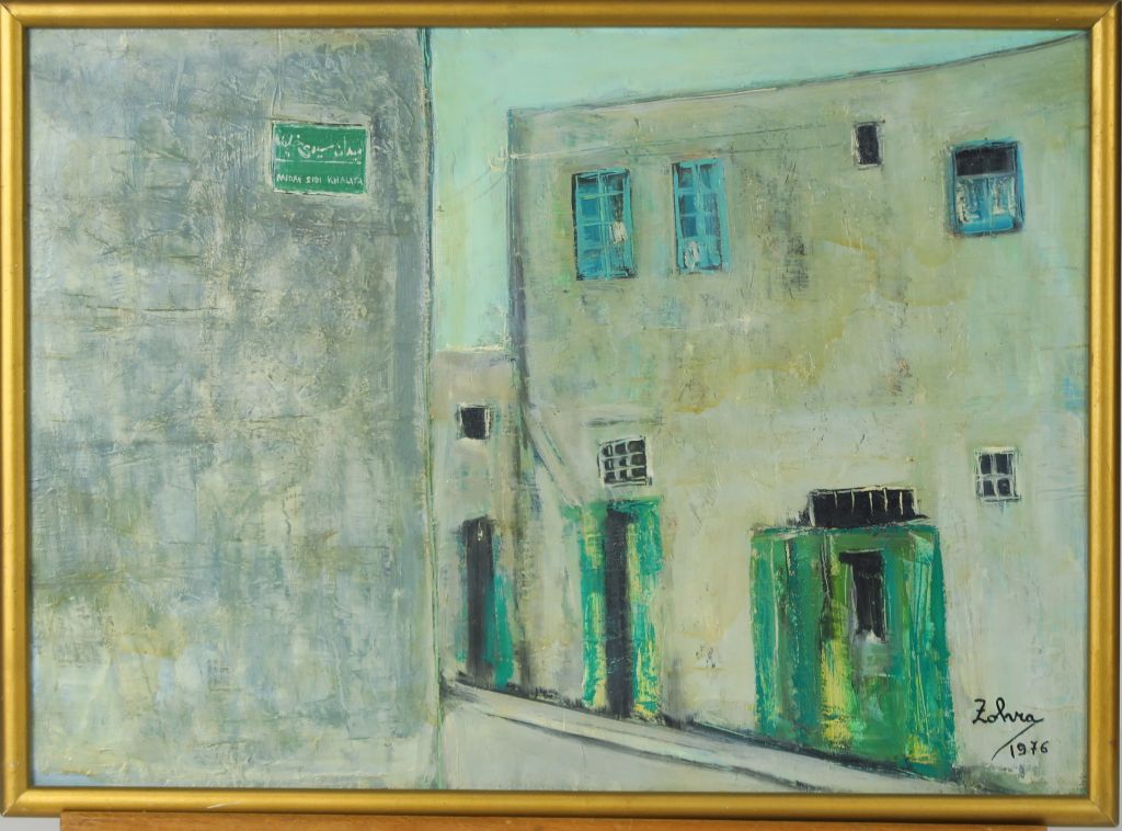 ZOHRA "Maisons de pêcheurs" Huile sur panneau. Signée en bas à droite et datée 76. 24,5 x 34 cm On y joint un dessin inséré à l'arrière de la composition "Pêcheurs devant leur maison" Collage. 22,5 x 37 cm