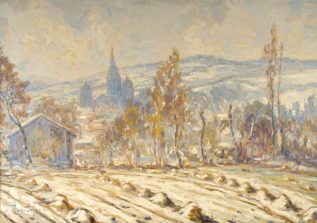 A. LAGARRIGUE ‘En Coumbet, matin de neige’, Huile sur toile, signée en bas à gauche et datée au dos 1945. 65 x 92 cm