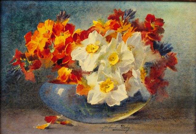 Blanche ODIN 'Bouquet de fleurs dans un vase bleu'. Aquarelle? Signée en bas. 18 x 27,5 cm