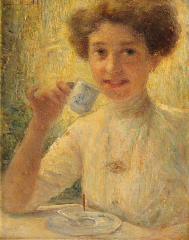 Corinna MODIGLIANI 'A l'heure du thé'. Huile sur toile marouflée, signée en haut à gauche. 30 x 24,5 cm