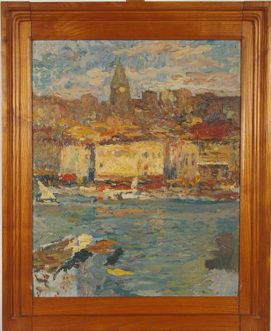 Henri MARTIN ‘Vue du port de Marseille’. Huile sur panneau. 46 x 38 cm. Cette vue du port de Marseille représente les façades ensoleillées sur le côté du vieux port, avec plus haut le clocher de l’église des Accoules qui domine la scène. Le peintre anime le paysage par un voilier rentrant dans la composition par la gauche et surtout par la touche mouvementée très expressive et les accents de couleurs vives. Cette vue est à rapprocher de l’époque où Henri Martin travaillait au décor de la Caisse d’Épargne de Marseille vers 1904. Un certificat de Monsieur Cyrille Martin sera remis à l'acquéreur. Provenance : ancienne collection Nougayrol. Expert : Michel MAKET : 17 avenue de Messine 75008 PARIS. 01.42.25.89.33. Expositions à Paris sur rendez-vous chez l'expert jusqu'au 13 mai. A Toulouse le 23 et 24 mai de 10h à 12h et de 14h à 18h, le matine de la vente de 10h à 12h