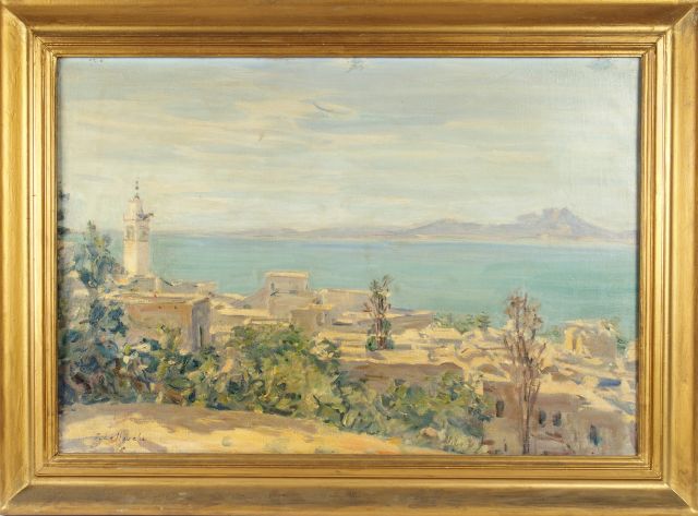 J. LELLOUCHE 'Ville d'Afrique du Nord'. Huile sur toile, signée en bas à gauche. 50 x 73 cm (petits repeints)