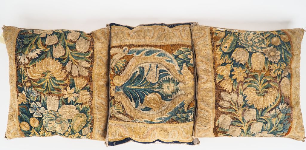 3 coussins constitués avec des fragments de tapisserie d' Aubusson XVIIème.