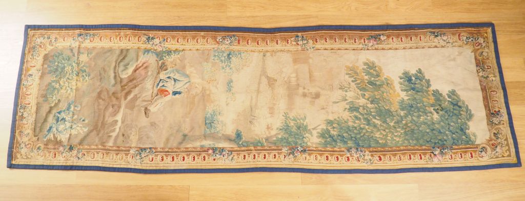 Fragment de tapisserie XVIIIème "Personnages dans un paysage". Dim. 315 x 92 cm