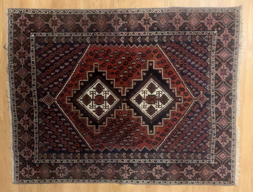 Tapis d'Orient. Fond rouge et bleu. Dim. 175 x 137 cm