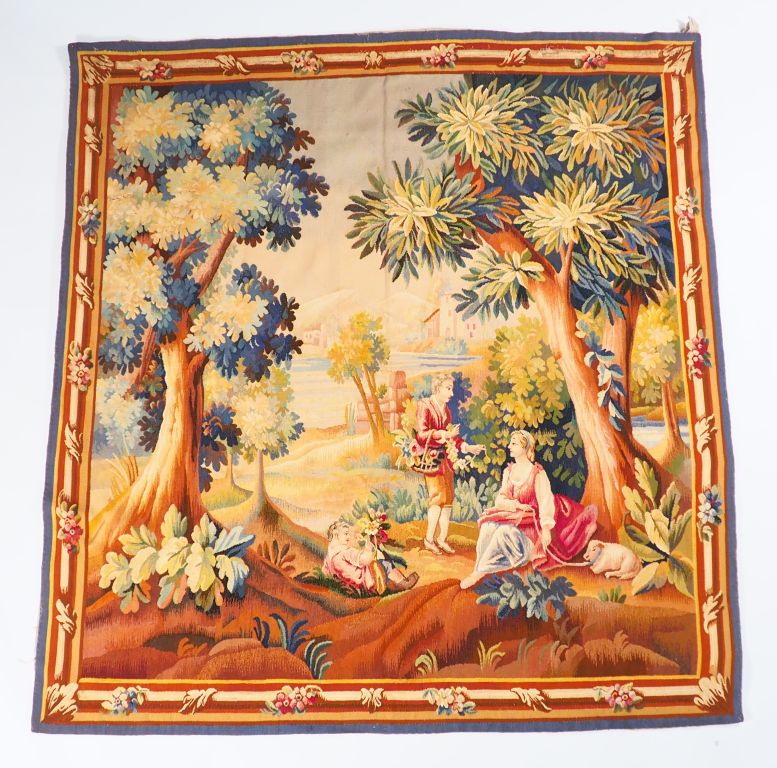Tapisserie d'Aubusson de style Louis XVI à décor de scène galante dans un paysage. Dim. 200 x 190 cm.