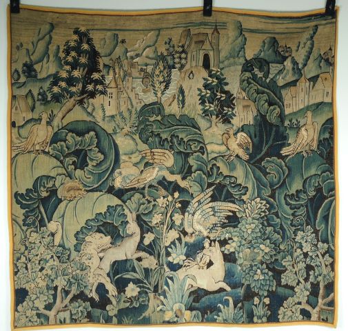 Tapisserie en laine et soie dite aux aristoloches ou feuilles de choux. Premier plan avec feuilles d’acanthe, pieds de vigne et fleurs animé de différents volatiles, d’un écureuil, d’un félin poursuivant un lièvre et d’un chien emportant un coq dans sa gueule , second plan, paysage montagneux avec étendues d’eau, villages, château et église (fragment, quelques restaurations). Audenarde, milieu du XVIe siècle Hauteur : 217 cm – Longueur : 232 cm