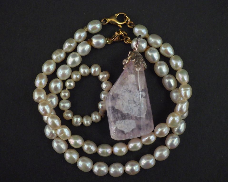 Ensemble comprenant : - deux bracelets de perles blanches. Fermoirs en métal doré. - une bague de perles blanches. - un pendentif ornée d'une pierre rose. Bélière en argent 925 en forme de feuillage et agrémentée d'un strass. H. 4,3 cm Poids tel. 14,76 g