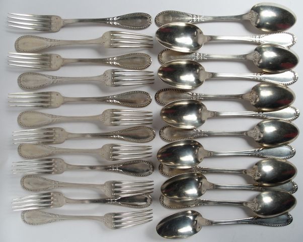 Ménagère en argent de style Louis XVI poinçon Minerve, MO : Laparra comprenant : 12 grands couverts, 12 couverts à entremets, 12 couverts à poisson, 12 petites cuillères, une louche et une cuillère à ragoût. Poids : 5210 g