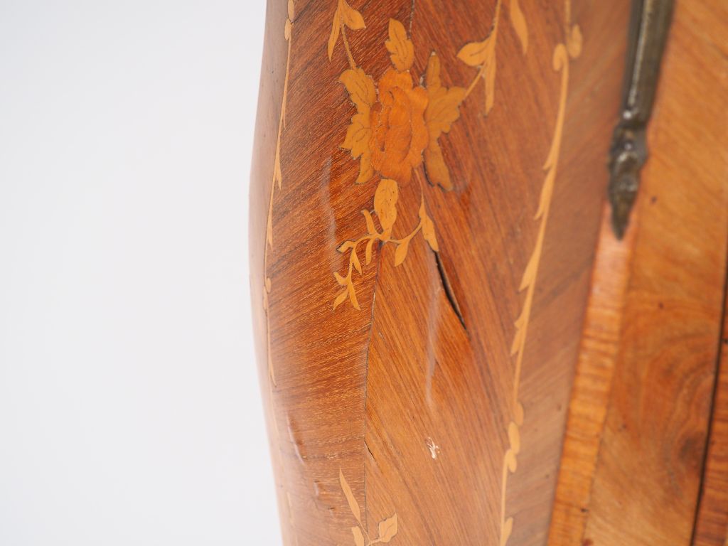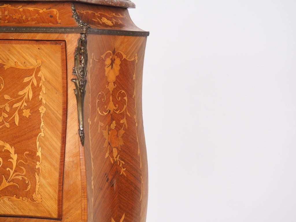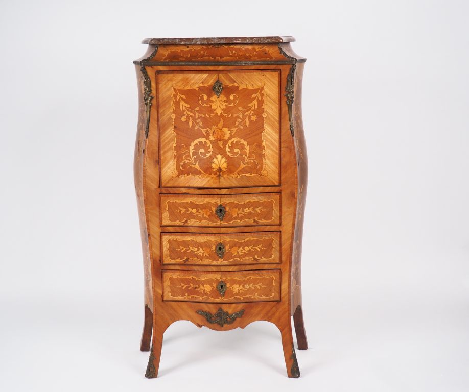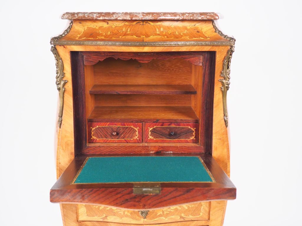 Secrétaire à abattant de style Louis XV en marqueterie à décor de fleurs et de rinceaux feuillagés, ornementation de bronze , ouvrant à un abattant trois tiroirs , dessus marbre rouge. Dim. 127 x 66,5 x 33 cm.