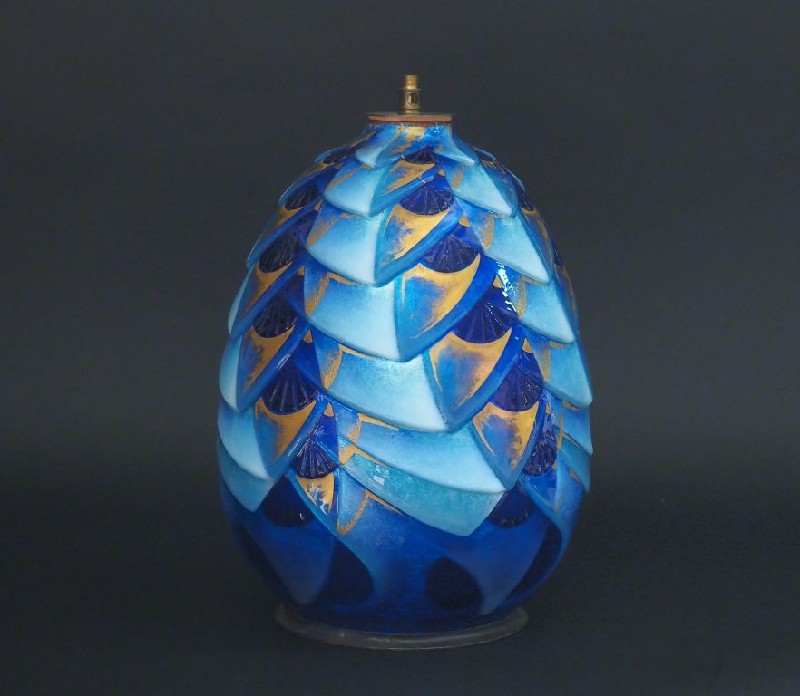 Camille FAURE à Limoges. Vase ovoide Art Déco en émaux, en camaieu de bleu rehaussé d'or , monté en lampe. Signé H. 30 cm