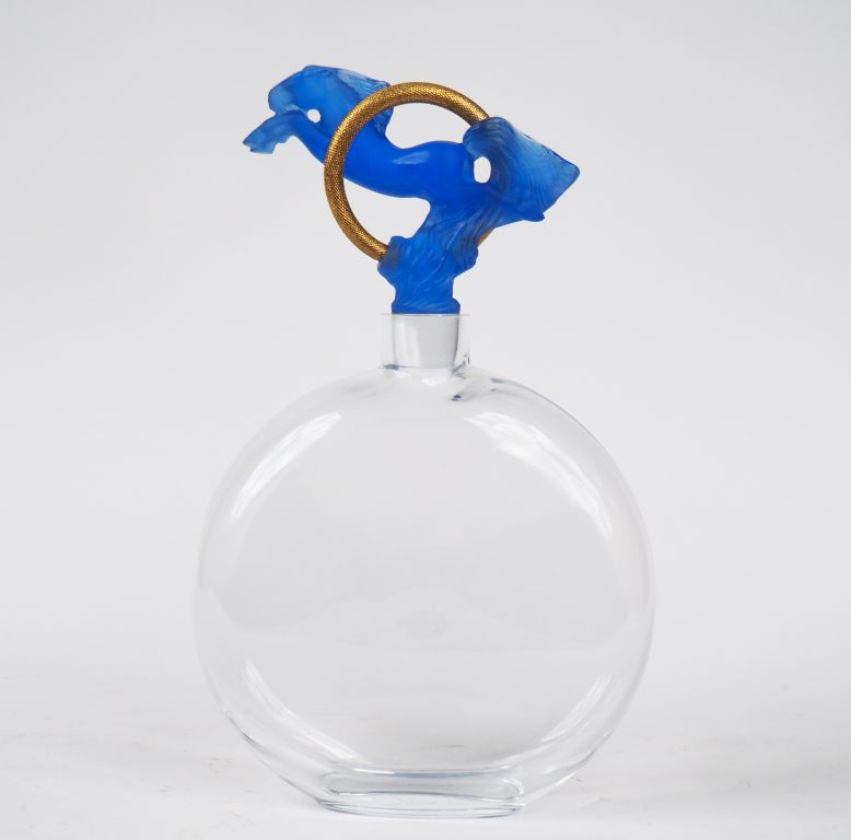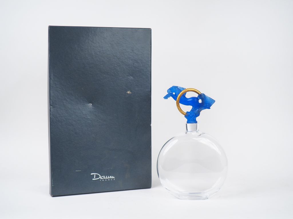 DAUM. France. Grand flacon en pâte de verre, cristal et métal doré, bouchon en forme de cheval. H, 30 cm