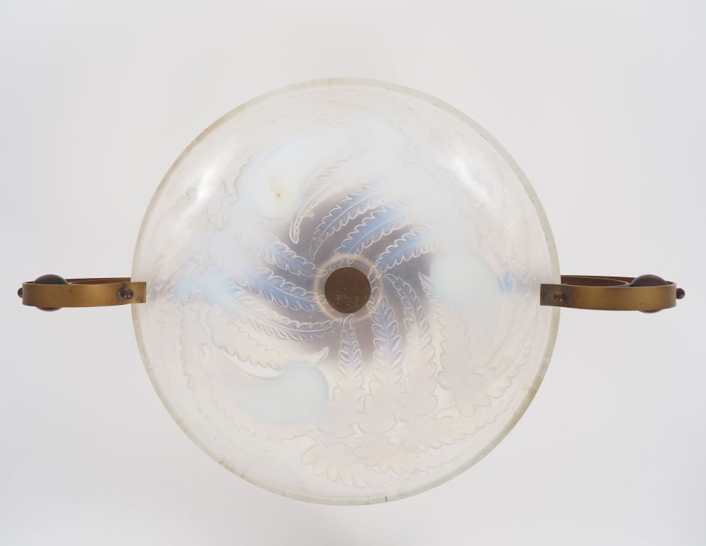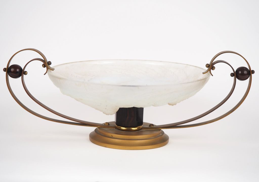 ETLING. Coupe montée de style Art Déco en verre et verre opalescent à décor de feuillage. Monture ajourée en laiton et ébene de macassar. Dim. 13 x 30 x 46 cm