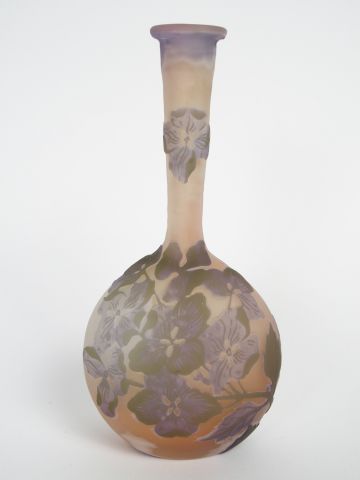 GALLE. Soliflore en verre à décor gravé en camée à l'acide de violettes sur fond rose pale. Signature à l'étoile. H. 17 cm