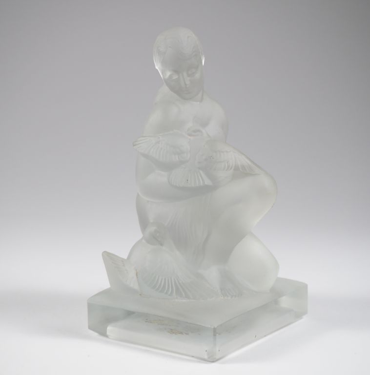 Groupe en verre ou cristal moulé "jeune femme aux colombes". H. 16 cm.
