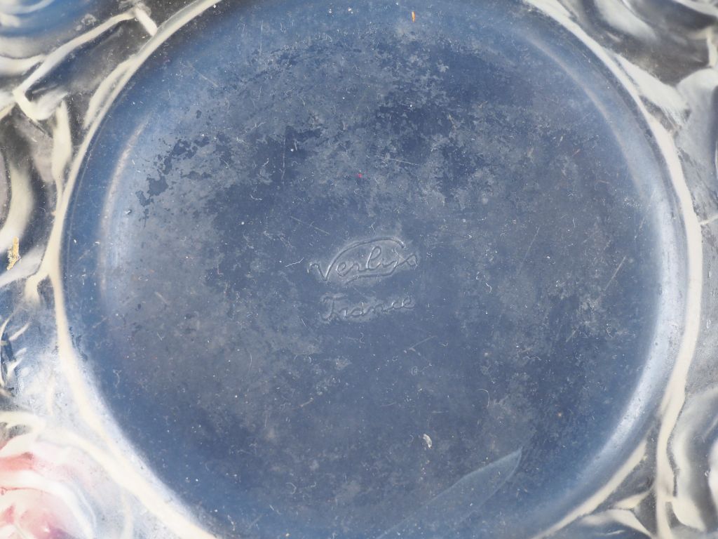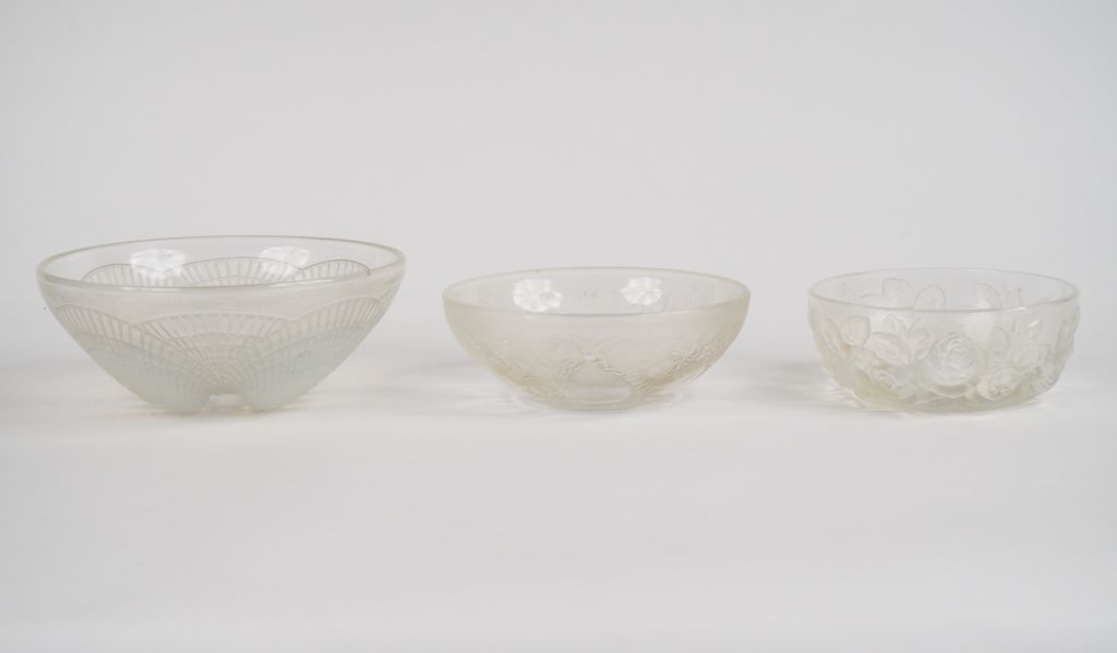 LALIQUE. Coupe en verre en partie opalescent à décor de coquilles. On y joint R. LALIQUE. Un bol en cristal signé VERLYS. Coupelle en partie opalescent à décor de roses