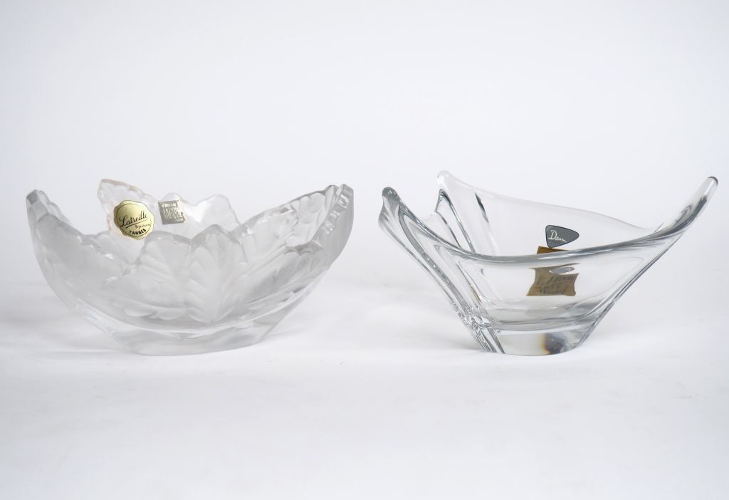 LALIQUE France. Coupe en verre blanc moulé pressé à décor feuillagé. Signée. Dim. 9,5 x 19 x 15,5 cm. On y joint un vide-poche en cristal DAUM France. Signé. Dim. 11 x 20 cm.