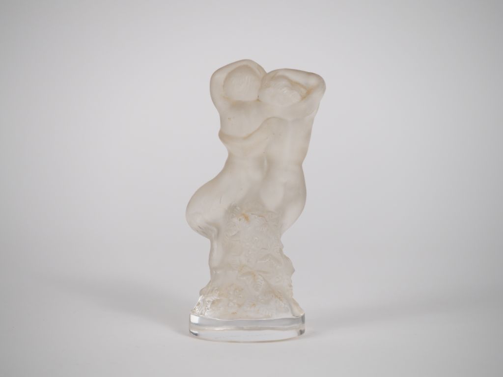 LALIQUE France. "Faune et nymphes". Sujet en verre blanc moulé-pressé. Signé. H. 14 cm.