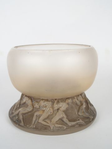 LALIQUE. Vase 'lutteurs' en verre moulé. Signé. R. Lalique. H. 14 cm (2 égrenures au col du vase)
